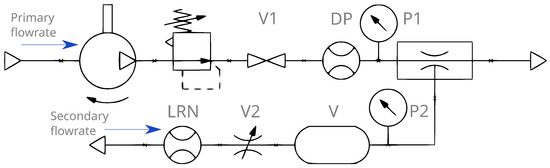 Schematic of the setups used for experiments. is a closing valve, is a two-way flow restrictor valve, is the differential flow meter, and are pressure sensors, is the long radius nozzle flowmeter, and V is the volume used in the research.