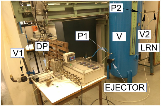 Supersonic vacuum generators, also known as vacuum ejectors or simply ejectors, are essential components in modern industrial automation systems [1,2,3]. A key performance metric for ejectors is the Total Evacuation Time (TET), which measures the time required to reach the minimum pressure, with shorter times preferred for evacuating a reference volume [4]. This research focuses on the empirical prediction of the TET, which is referred to as the Predicted Total Evacuation Time (PTET). Other key design metrics for ejectors include the characteristic curve , which relates the change in the absorbed flow rate (or secondary flow) to the working pressure [5], and the polytropic coefficient evolution curve , which relates the change in the polytropic coefficient to the working pressures. These metrics provide the basis for comparing ejectors and improving their performance. Since TET directly influences the efficiency and suitability of the ejectors for various applications [6], accurately predicting PTET relies on precisely capturing both the characteristic curve and the polytropic curve . Precise experimentation setups allow for evaluating the variation of flow rate and the polytropic coefficient across different working pressures, leading to the development of the and curves.