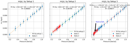 Figure 6 shows the refinement of the data used to capture the characteristic curve of with setups 1, 2 and 3. Setup 2 uses the data obtained in setup 1 (in blue) and adds the newly captured data (in red). The same procedure for setup 3, which used the data captured by setup 1 and 2 (in blue) and added the new data (in red). Setup 3, described in Section 2, shows the evidence of the bP and was used in the piece-wise fitting equation.