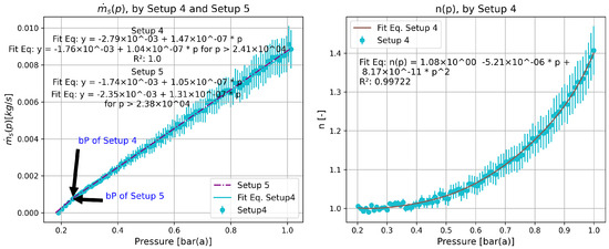 Figure 8 shows on the left the characteristic curve captured with setup 4. In the same graph, setup 4 and setup 5 are compared, which are taken from [5]. The data are presented along with its fitting curves, its equations, and the pressure breakpoint. On the right, there is the polytropic curve captured with setup 4 and its fitting curve. Capturing this curve using setup 4 shows a perfect second-order polynomial trend.