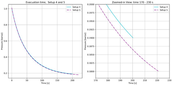 (Left): Predicted evacuation time graph for setups 4 and 5. (Right): Zoomed-in view of the final evacuation stage. Setup 5 demonstrates better performance, achieving lower minimum pressure and shorter evacuation times.