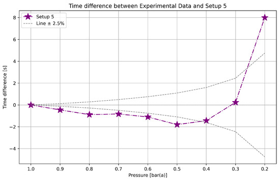 Figure 11 illustrates the deviation between the experimental evacuation time and the predicted time from setup 5. At higher pressures, the predicted evacuation time exceeds the experimental values, with a maximum difference of 2 s at 0.5 bar(a). However, at lower pressures, setup 5 demonstrates improved performance by reducing the PTET by 8.1 s (4%) compared to the experimental TET. These data are further corroborated in Table 4.