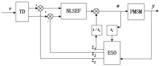 The Active Disturbance Rejection Controller (ADRC) consists of three core components: the Tracking Differentiator (TD), the Extended State Observer (ESO), and Nonlinear State Error Feedback (NLSEF). The primary function of the TD is to effectively extract the original signal and its differential signal from discontinuous or noisy signals in practical engineering applications. This enables fast and overshoot-free tracking of a given reference signal, thereby enhancing the control system’s performance. The ESO is the heart of the ADRC, responsible for real-time observation of the system’s output state variables and total disturbances. It compensates for detected disturbances to ensure the system maintains stability and efficient control performance even under external interference. The NLSEF receives the error signals and their derivatives during transient states and computes the integral of the error signal. By performing a nonlinear combination of these three signals, NLSEF generates the final control law, achieving optimal system control. The structure of the controller is presented in Figure 2.