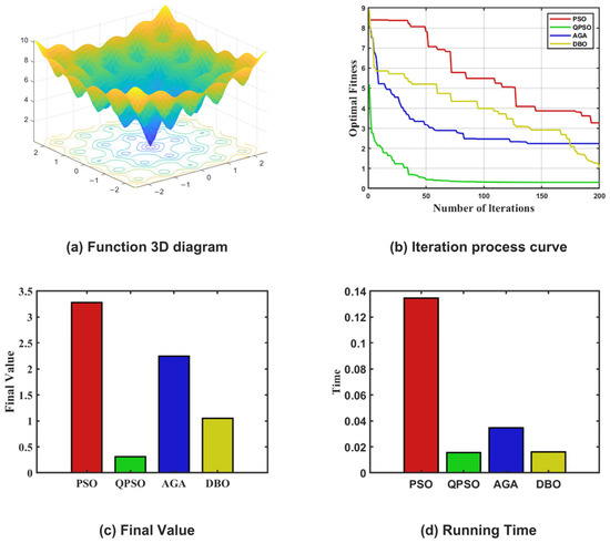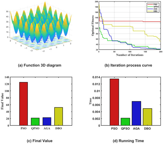 The Rastrigin function features an irregular peak structure within the search space, making it easy for particles to become trapped in local optima during the algorithm’s iterative optimization process. By offering a complex landscape with many local minima, it effectively evaluates the performance of optimization algorithms in solving complex problems. The test results are shown in Figure 8.