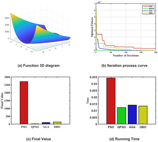 A statistical comparison of the computation time, the number of iterations to convergence, and the converged fitness value for the four test functions using the PSO, improved QPSO, AGA, and DBO algorithms is provided. The results are shown in Table 2 below.