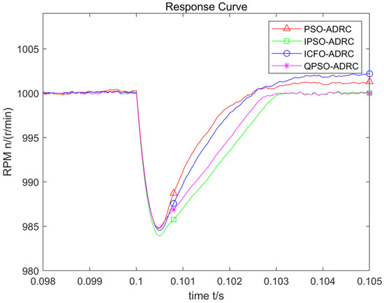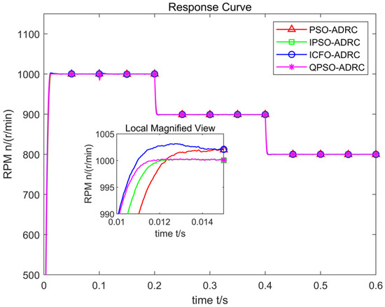 In verifying the performance of the QPSO optimization algorithm in the active disturbance rejection controller (ADRC) for permanent magnet synchronous motors (PMSM), the simulation platform used is Matlab/Simulink (R2023b). The performance of four different control strategies, PSO-ADRC, Improved Particle Swarm Optimization (IPSO-ADRC) [27], Improved Chicken Flock Optimisation-ADRC (ICFO-ADRC) [28], and QPSO-ADRC, is compared under the same PMSM model. The IPSO algorithm enhances particle distribution in the search space by incorporating chaotic initialization, particularly logistic chaos mapping, into the traditional PSO algorithm. To prevent particles from becoming trapped in local optima, IPSO also integrates crossover and mutation operations from genetic algorithms. The ICFO algorithm is inspired by the foraging behavior of chicken flocks in nature, simulating the interactions between chickens while searching for food. Its objective is to find the optimal solution by mimicking the cooperation and competition relationships among individuals in a chicken flock.