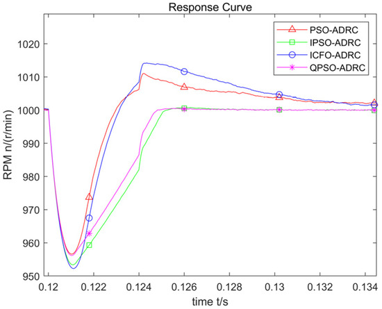 Robustness is a critical characteristic in practical control applications [29]. To verify the robustness of QPSO-ADRC, the motor speed is set to 1000 r/min. External loads are applied at 0.1 s and 0.12 s, and reduced at 0.124 s. A real-time noise module is also added during the simulation to simulate environmental disturbances that the motor may encounter during operation. The experimental results, shown in Figure 13 and Figure 14, indicate that the QPSO-ADRC system recovers to a steady state quickly, with minimal overshoot throughout the process. QPSO-ADRC outperforms other control methods, which exhibit larger overshoot and oscillation after load disturbances, along with longer response times. Although ICFO-ADRC recovers well initially after load disturbances, its recovery speed is slower than that of QPSO-ADRC. QPSO-ADRC can quickly and smoothly return to the target speed without excessive oscillation. In summary, QPSO-ADRC shows significant advantages in handling complex conditions like load disturbances and noise interference, with strong robustness.