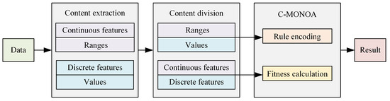 Once the data processing is complete, it can be forwarded to C-MONOA for association rule mining. The ranges and values are crucial for rule encoding, ensuring that the values in the initialized population remain within acceptable limits. Additionally, the continuous features and discrete features play a vital role in calculating fitness function scores, such as support statistics, thereby enhancing the effectiveness of the mining process.