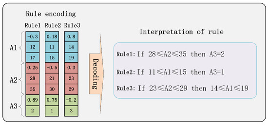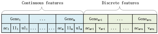 In alignment with the objectives of this study, the Michigan method is designed to individually optimize each rule through chromosome encoding. Each chromosome comprises multiple genes, with the total number of genes corresponding to the number of features in the dataset. The rule encoding process is illustrated in Figure 2. For continuous data, each gene is structured with three elements: the first element, denoted as ac, indicates the presence of a specific feature in the rule. The second and third elements, ll and ul, represent the lower and upper limits of the rule item, respectively. In the case of discrete data, the gene structure includes two fields: the first field ac again signifies the existence of the feature, while the second field v holds the corresponding value for nominal or discrete attributes. Within the framework of the Michigan coding scheme, the value of the ac field ranges from −1 to 1. Values between −1 and 0 imply that the feature is absent from the rule, while values exceeding 0 (ranging from 0 to 1) indicate its presence. Specifically, within this positive range, values from 0 to 0.5 suggest that the feature appears in the antecedent of the rule, whereas values from 0.5 to 1 signify its role in the consequent of the rule. This nuanced encoding strategy allows for a flexible representation of rules that accommodate both continuous and discrete data effectively.
