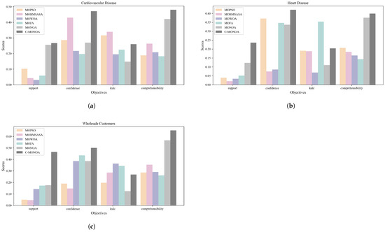 To facilitate a meaningful comparison, modifications were made to the referenced algorithms to enable their application to mixed-attribute datasets. Figure 4 presents a comparative analysis of the performance scores achieved by various algorithms and their variants across different datasets. The first image illustrates the results of the C-MONOA applied to the Cardiovascular Disease dataset. In this instance, C-MONOA demonstrates superior performance in mining association rules compared to other algorithms, such as MOPSO, MOBMSASA, MOWOA, MOFA, and MONOA. Specifically, C-MONOA achieves an average support score of 0.27, an average confidence of 0.47, an average Kulc value of 0.26, and an average comprehensibility of 0.48, indicating its effectiveness in generating high-quality rules.