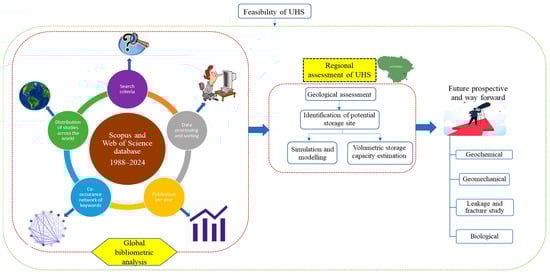 In-depth examination and review of predominant influencing factors and mechanisms were undertaken to facilitate the interpretation of UHS within different geological settings. The methodology for reviewing UHS consists of several comprehensive steps. First, a literature review is carried out to obtain existing knowledge on UHS by searching scientific databases for relevant keywords. This includes reading articles, reports, and case studies from prominent journals and industry magazines to describe key geological formations, contemporary technologies, and safety concerns. Next, a geological assessment assesses Lithuania’s geological formations, focusing on parameters such as porosity, permeability, caprock integrity, and formation depth, utilizing data from national geological surveys, academic publications, and industry reports. Figure 1 illustrates the integrated methodology for conducting a comprehensive literature review, global bibliometric analysis, and regional assessment of Underground Hydrogen Storage (UHS), with a focus on Lithuania.