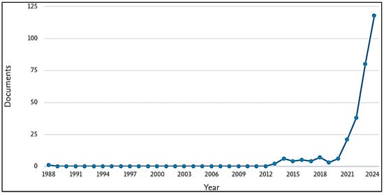 Here, bibliometric analysis is used to quantitatively measure the research impact of the UHS study field [67]. The data from the Scopus and Web of Sciences database are taken from the years 1988–2024 for the bibliometric analysis. With the search keyword “Underground Hydrogen Storage” in the Scopus database, 140 research papers were considered for the analysis. The variation in the number of publications has been shown in Figure 2 from 1988 to 2024. There has been a significant increase in the number of publications since 2020. This indicates a growing interest and attention from researchers in studying and contributing to the field of UHS.