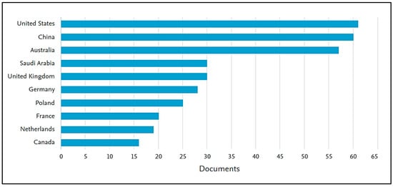 The analysis of publication patterns across the countries covered in the identified articles offers valuable insights into the topic. The visual representation employs varying sizes of publication icons, corresponding to the volume of publications on UHS studies. Figure 3 shows that the United States leads in research contributions, followed closely by China and Australia. These countries are at the forefront of UHS research, reflecting their strategic focus on sustainable energy technologies. Other significant contributors include Saudi Arabia, the United Kingdom, and Germany, showcasing a global effort to advance this critical area of study. The findings underscore the growing recognition of UHS as a critical component in the transition to a low-carbon energy system, driven by technological advancement, increased investment, and a global push toward decarbonization.