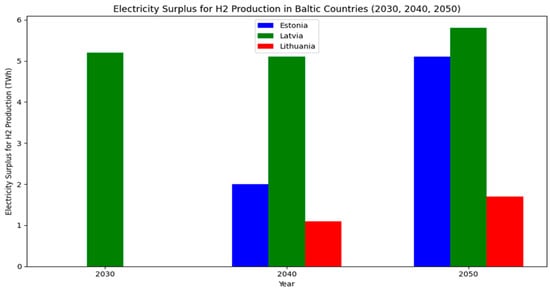 UHS technology is still in its early stages in Europe, especially in the Baltic Basin, but there is growing interest and research in this area, indicating potential for its implementation on an industrial scale [68,69,70]. Recently, a document published on H2 production from renewable sources in the Baltic Sea region proposes increasing H2 production through wind power by 2050, as shown in Figure 5 [71]. As H2 production from renewable sources increases, subsequently we must explore the UHS in the Baltic Basin.