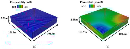 3D model, homogeneous (a) and heterogeneous (b) used for cyclic H2 storage simulation showing permeability distribution.