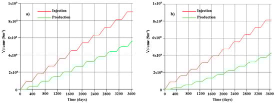 The total H2 injection volume (in Standard m3, Sm3) (in red) and production volume (Sm3) (in green) plots for (a) homogeneous and (b) heterogeneous models.