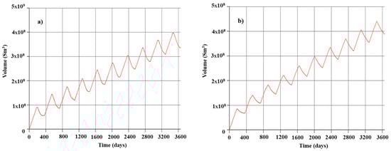 The plots of the total volume (in Sm3) of H2 in place during a 10-year cycle (a) for homogeneous and (b) for heterogeneous geological settings.