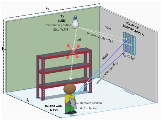 To mitigate the aforementioned problems, in recent years, intelligent reflecting surfaces (IRSs) have gained significant attention as a transformative technology in wireless communication systems, including VLC [,,]. An IRS consists of large arrays of passive reflecting elements that can dynamically control the phase, amplitude, and polarization of incoming waves, allowing for the redirection and enhancement of signals in a highly efficient manner []. By intelligently adjusting the reflection properties of each element, the IRS can be used to mitigate the effects of signal blockages, enhance coverage, and improve signal quality, especially in environments with obstacles or NLoS conditions []. The key advantage of the IRS is that it operates without requiring additional active power, making it a cost-effective and energy-efficient solution to improve communication performance []. Moreover, the flexibility in configuring the reflection pattern allows the IRS to adapt in real time to changing environmental conditions, making it an ideal technology for dynamic and complex indoor settings.