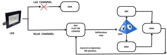 Building on these technologies, the proposed work integrates IRS and ADR systems to address the challenges of VLC in environments with total or partial shadowing. In this approach, the IRS is used to strategically reflect and direct light signals toward ADR-equipped receivers, maximizing the SNR even in NLoS conditions. The IRS is placed in optimal locations in the environment, and its reflection characteristics are dynamically adjusted using machine learning algorithms to ensure the most effective redirection of signals. The ADRs, on the other hand, further enhance reception by capturing signals from multiple directions and optimizing their combination using intelligent processing techniques. This dual approach leverages the strengths of IRS and ADR technologies to create a robust VLC system capable of maintaining high spectral efficiency and reliability even in challenging indoor scenarios.