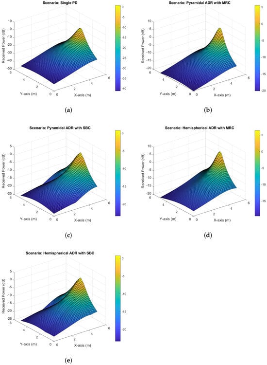 The pyramidal and hemispherical ADRs using MRC achieve maximum powers of 5.49 dB and 6.37 dB, respectively, with notable improvements in minimum power levels to −20.14 dB and −19.59 dB. These results underscore the advantage of combining signals from multiple PDs, with the hemispherical design being more effective due to its broader angular coverage. Meanwhile, SBC, while simpler, performs poorly compared to MRC. Both pyramidal and hemispherical ADRs with SBC yield lower maximum powers (around 0.81 dB) and higher minimum power losses (−23.40 dB), as SBC does not take full advantage of the ADRs.