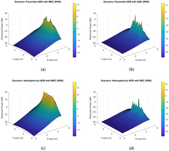 In particular, the hemispherical ADR with SBC achieved the highest maximum power of 11.94 dB, although its minimum power of −17.96 dB remains less favorable compared to MRC-based configurations. These findings emphasize the importance of RNN optimization in improving both peak and baseline performance. Furthermore, the performance gains underscore the synergy between advanced ADR designs and optimized IRS placement in addressing nonuniformities in power distribution in VLC systems.