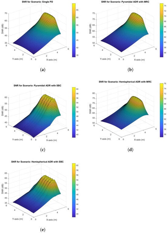 However, SBC mechanisms perform poorly compared to MRC, as seen in pyramidal and hemispherical ADRs with SBC, which share maximum and minimum SNR values of 60.78 dB and 38.62 dB, respectively. These configurations, while improving the single-PD setup, exhibit limited robustness in maintaining a high SNR across the coverage area. The results underscore the critical role of ADR geometry and signal processing mechanisms in optimizing the SNR distribution. MRC is proving particularly effective in mitigating spatial variability in the SNR and ensuring uniform communication performance in indoor VLC systems.