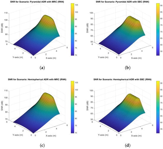 The hemispherical ADR with MRC also shows substantial gains, with a maximum power of 12.11 dB and a minimum of −8.94 dB, compared to 6.37 dB and −19.59 dB in the non-optimized scenario. These results highlight the robust performance of the hemispherical ADR in uniformly distributing power across the scenario when combined with RNN-optimized IRS positioning and MRC. However, the SBC technique, while improved, remains less effective than MRC. For the pyramidal ADR with SBC, the maximum power increased to 10.59 dB, and the minimum power improved to −18.11 dB, compared to 0.81 dB and −23.40 dB without the RNN.
