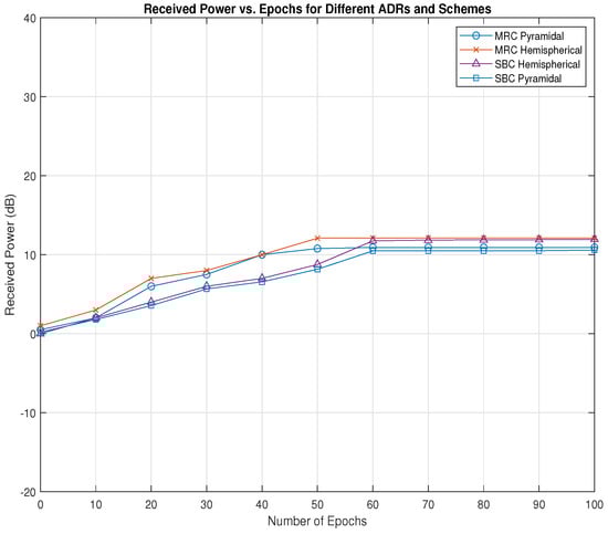 Figure 8 presents the relationship between the number of epochs and the received power for the ADR geometries and signal processing schemes. The results show that ADRs that utilize MRC (both pyramidal and hemispherical) achieve the highest received power levels, converging to approximately 10.92 dB and 12.11 dB, respectively. The figure demonstrates that RNN-based optimization facilitates rapid convergence, with MRC configurations stabilizing within the first 40 and 50 epochs and exhibiting minimal variation afterward. This underscores the efficiency of RNN in achieving optimal IRS placement quickly.