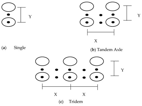 The impact of traffic and vehicles on pavement design can be classified into three main categories: fixed traffic, fixed vehicle, and variable vehicle and traffic. In fixed traffic scenarios, pavement thickness is determined based on the load of a single wheel, disregarding the number of load repetitions [9,10]. However, in situations involving different types of wheels, such as heavy wheel loads on highway pavements, they need to be converted to an equivalent single-wheel load (ESWL). Conversely, the fixed vehicle method considers the number of load repetitions of a standard axle, typically a single axle with dual tires and a load of 18 kips (80 kN). For pavements exposed to various axle types, like tandem or tridem axles, they are converted to an equivalent axle load factor (EALF) to achieve an equivalent effect based on an 18 kip (80 kN) single-axle load [11,12].