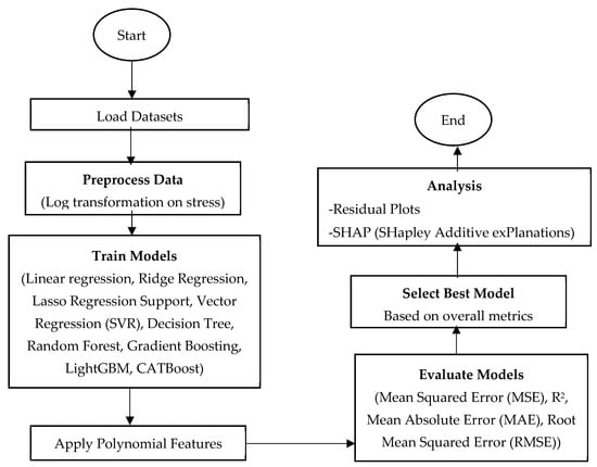 In this study, a machine learning approach was employed to optimize and assess several regression models for predicting stress values in single, tandem, and tridem axles. The procedure began by loading the dataset and applying preprocessing steps, such as a log transformation to the target variable (stress) to stabilize its variance. The dataset was then divided into training and testing subsets, with 80% used for training and 20% for testing and evaluation. Various regression models were trained, including linear regression, ridge, lasso, support vector regression (SVR), decision tree, random forest, gradient boosting, LightGBM, and CATBoost. To improve model performance, polynomial features were added. The models were evaluated using performance metrics like mean squared error (MSE), R2, mean absolute error (MAE), and root mean squared error (RMSE). The best-performing model was chosen based on these metrics. Additionally, to assess model interpretability and feature significance, diagnostics such as residual plots and Shapley Additive Explanations (SHAP) analysis were performed. The results were visualized to provide a better understanding of the model’s performance. A flowchart summarizing the entire process is shown in Figure 2.