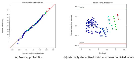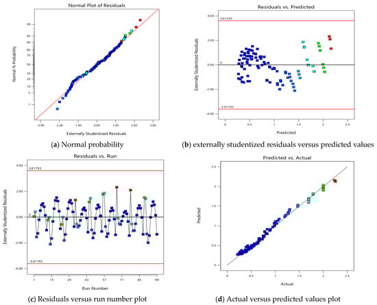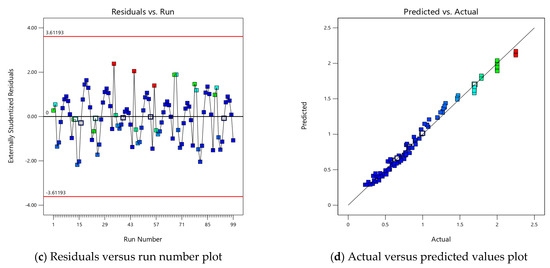 Figure 5 shows the residual plots of the quadratic model. These plots shown in Figure 5 include the normal probability plot, residuals versus predicted values, residuals versus run number, and actual versus predicted values. However, these plots describe how well the model fits the data and predicts the stress accurately. The normal probability plot is essential for assessing whether the residuals, or errors, follow a normal distribution. The data points on this plot should form a straight line, indicating that the residuals are normally distributed. As seen in Figure 5, the residuals are close to the theoretical line, suggesting that the data are normally distributed. Furthermore, the plot of externally studentized residuals versus predicted values is used to evaluate the reliability of the model. This plot is crucial for assessing homoscedasticity, which refers to the assumption that the error terms (the differences between the observed and predicted values of the dependent variable) have equal variance across all levels of the independent variables. As seen in Figure 5, the residuals are symmetrically distributed around zero, showing no clear pattern or trend. The residuals versus run number plot is used to detect any autocorrelation among the residuals, which would suggest that the errors are not independent. It can be seen in Figure 5 that the residuals transition randomly between positive and negative values, indicating that there is no unsystematic pattern. This randomness suggests that there is no autocorrelation, indicating that the model accurately describes the relationship between the independent variables and the stresses. On the other hand, the plot of actual versus predicted values illustrates the model’s accuracy in predicting the observed values. As noted in Figure 5, the data points closely follow the 1:1 line, indicating a strong correlation between the actual values and those predicted by the model. This close alignment proves the model’s effectiveness in predicting the developed stresses.