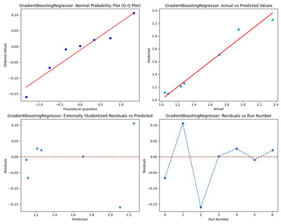 The results shown in Table 11 illustrate the performance of different regression models, with gradient boosting showing as the best model. It shows the lowest testing MSE (0.001118), MAE (0.023510), and RMSE (0.033436), with a near-perfect R2 value of 0.999367, demonstrating excellent accuracy and generalization. Random forest likewise works well, with low testing errors (MSE: 0.005714, R2: 0.996763) and negligible overfitting. Decision tree, however, displays evidence of overfitting, attaining excellent training results (MSE: 0, R2: 1) but inadequate testing performance (MSE: 0.012414, R2: 0.992966). Linear and ridge regression produce consistent results with high R2 values (0.990983 and 0.990604, respectively), although ridge slightly follows linear. Furthermore, lasso regression struggles with severe underfitting, indicated in its large testing errors (MSE: 1.702942, R2: 0.035162). LightGBM and CatBoost perform well during training but demonstrate poor generalization ability on testing data. Therefore, gradient boosting is the most dependable model. In addition, the gradient boosting model is further validated by diagnostic plots, as shown in Figure 8. The Q-Q plot indicates that the residuals are regularly distributed, confirming the assumption of normality. The actual vs. predicted values plot illustrates a good correlation between predicted and actual values, presenting high predictive accuracy. The externally studentized residuals vs. predicted values plot indicates no bias, confirming the absence of systematic mistakes in the model. Finally, the residuals vs. run number plot indicates that the model’s predictions are independent of the data point sequence, ensuring stability. Overall, gradient boosting stands out as the most dependable model, supported by consistent performance across all evaluation metrics. However, the SHAP value analysis in Figure 9 displays that the thickness of the pavement has the most significant impact on model predictions, as confirmed by its high average SHAP value. Otherwise, X spacing and Y spacing show lesser average affects, with Y spacing demonstrating a more consistent influence.