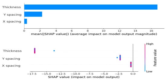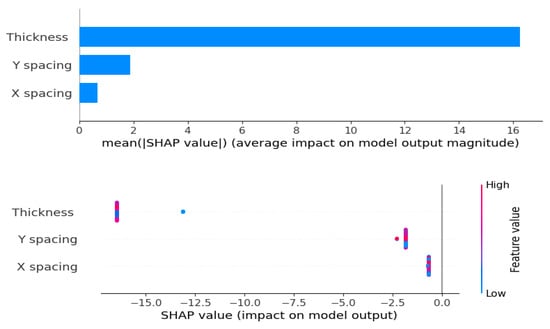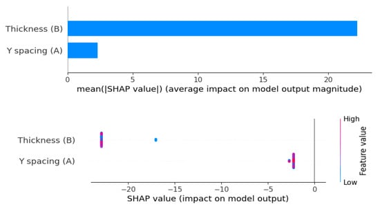 Table 10 displays the performance of different regression models. The results indicate that gradient boosting is the top performer, with the lowest testing MSE (0.006061), RMSE (0.077851), and a high R2 value of 0.971168, demonstrating its strong ability to generalize to new data. Likewise, random forest performs well, with low testing MSE (0.016694) and RMSE (0.129204), and a solid R2 of 0.920587. However, the decision tree model overfits the training data, obtaining desirable outcomes on the training set (MSE: 0, R2: 1, MAE: 0, RMSE: 0) but struggling with testing data (MSE: 0.020817, R2: 0.900970, MAE: 0.124350, RMSE: 0.144282). The huge disagreement between its training and testing performance indicates it is memorizing the training data instead of learning general patterns. Both linear and ridge regression illustrate uniform results, with ridge slightly beating linear regression on the testing data. On the other hand, lasso regression displays considerable underfitting, with high errors and a negative R2 value for testing. LightGBM’s performance is insufficient, with large errors in both training and testing. Meanwhile, CatBoost performs moderately. In summary, gradient boosting is the most dependable model. To further confirm the efficiency of gradient boosting, diagnostic plots were studied as shown in Figure 6. The Q-Q plot demonstrated that the residuals follow a normal distribution, verifying the model’s correctness. The actual vs. predicted plot also indicated strong alignment, reflecting the model’s predictive reliability. Additionally, the externally studentized residuals plot confirmed there was no bias, and the residuals vs. run number plot indicated that the model’s predictions were not influenced by the sequence of the data. These diagnostics together prove gradient boosting as an effective and stable model. Figure 7 presents Shapley Additive Explanations (SHAP) values for the parameters of the thickness and spacing. Thickness (B) has a considerably greater average impact on predictions, which results in noticeable variances in outcomes. Otherwise, Y spacing demonstrates a more consistent and uniform effect, contributing uniformly across different cases.