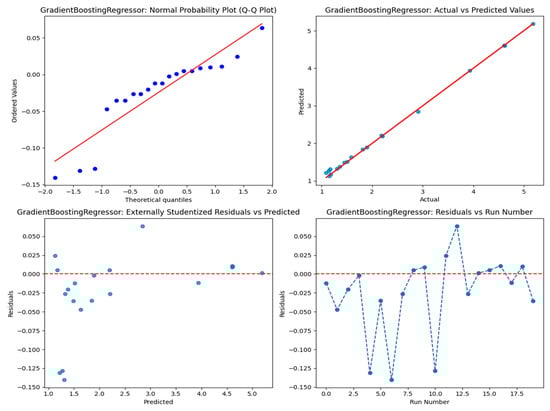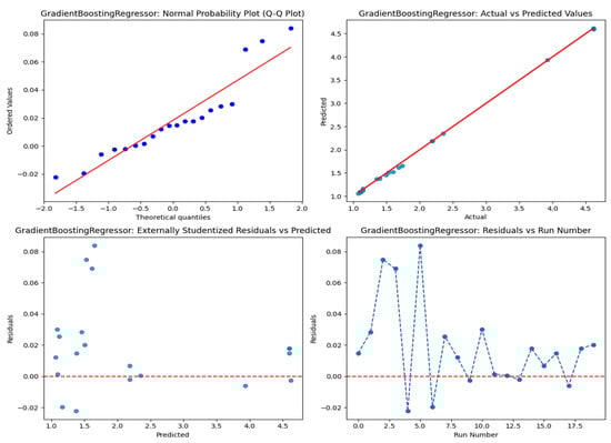 The Table 12 demonstrates the performance of various regression models based on significant metrics. Gradient boosting is demonstrated as the best performer, with the lowest testing MSE (0.003260), MAE (0.037326), and RMSE (0.057093), as well as an almost perfect R2 value of 0.998295, suggesting superior precision and generalization. Random forest also performs well, with a modest variation between training and testing results (MSE: 0.001837 vs. 0.013046, R2: 0.998324 vs. 0.993176), showing low overfitting. On the other hand, decision tree exhibits obvious overfitting, obtaining perfect training results (MSE: 0, R2: 1) but poorer testing performance (MSE: 0.014616, R2: 0.992354). Both linear regression and ridge regression perform consistently, with high R2 values and low errors, albeit ridge marginally trails behind linear regression. Lasso regression faces significant challenges with severe underfitting, as shown by its high testing error (MSE: 1.913,948) and a negative R2 value (−0.001202). While LightGBM and CatBoost perform well during training, their higher testing errors (MSE: 0.114631 and 0.115462, respectively) and lower R2 values (0.940036 and 0.939601) suggest they struggle to generalize effectively to unseen data. To further test the efficiency of gradient boosting, diagnostic plots were employed to verify its accuracy, as shown in Figure 10. The normal probability plot (Q-Q Plot) demonstrates that the residuals follow a normal distribution with acceptable deviations. However, the actual vs. predicted values plot reveals significant alignment, showing good predictive accuracy. The externally studentized residuals plot verifies no bias or systematic mistakes. Meanwhile, the residuals vs. run number plot illustrates stable, random swings, demonstrating the model’s robustness and independence from data sequence. The SHAP value investigation displayed in Figure 11 demonstrates that “Thickness” exerts the most significant influence on model predictions, as indicated by its elevated average SHAP value. This means that modifications in thickness result in considerable changes in outcomes. On the other hand, X spacing and Y spacing exhibit lesser impacts, with Y spacing suggesting a more stable effect.