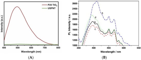 (A) photoluminescence spectra of P25 TiO2 and USPNT [85] and (B) Photoluminescence spectra of P25 (a) and Au–TiO2 containing various amounts of Au (b–d) [86].