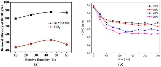(a) Removal efficiency of formaldehyde using Ti1MS2-550 and TiO2 increasing the relative humidity [94] and (b) degradation of formaldehyde using g-C3N4-TiO2 in different conditions of relative humidity [95].