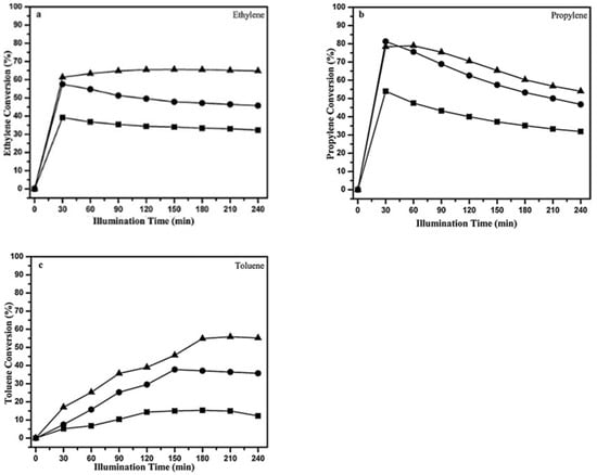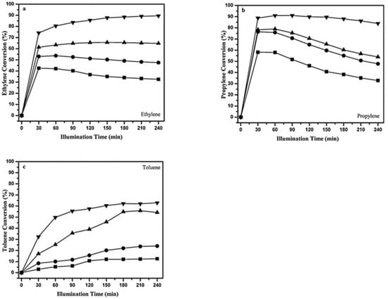 Conversion of ethylene (a), propylene (b), and toluene (c) with different initial concentrations of pollutant: (▼) 100 ppm; (▲) 200 ppm; (●) 300 ppm; (■) 500 ppm [96].