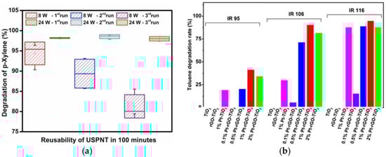 (a) Degradation of p-xylene using USPNT under different power daylight (8 and 24 W) [85] and (b) degradation rate of toluene using Pt-rGO-TiO2 with different light intensities (95, 106 and 116 mW/cm2) [97].