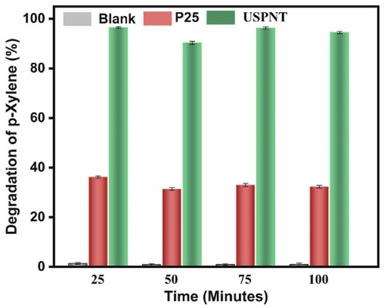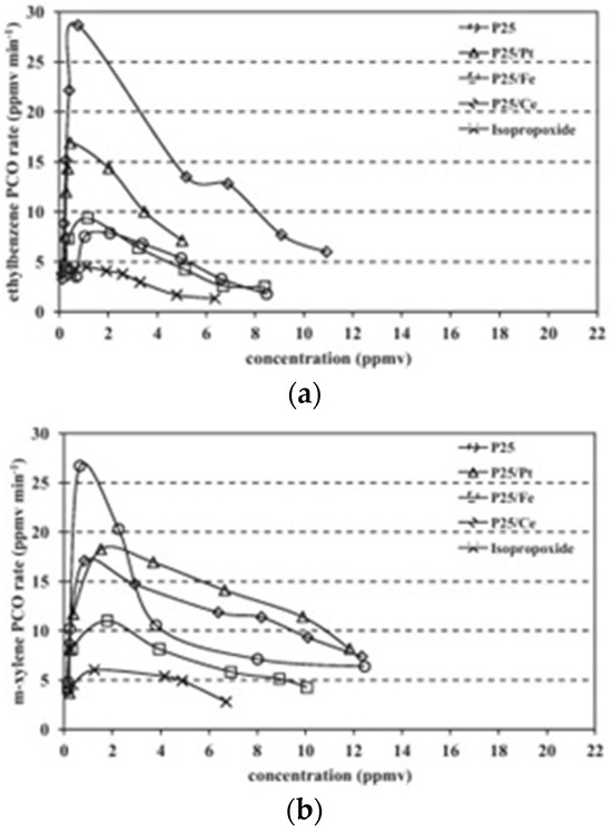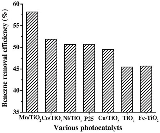 The initial concentration of the target pollutant can influence photocatalytic oxidation efficiency in various ways. Generally, lower initial concentrations lead to higher degradation rates. High pollutant concentrations can quickly saturate the catalyst’s active sites with by-products, limiting efficiency. Additionally, elevated pollutant concentrations can reduce quantum yield by adsorbing or scattering light, thus decreasing the light available to the photocatalyst. For instance, the removal of toluene, ethylene, and propylene using TiO2 nanoparticles decreased as initial pollutant concentrations rose from 100 to 500 ppm (Figure 6) [96].