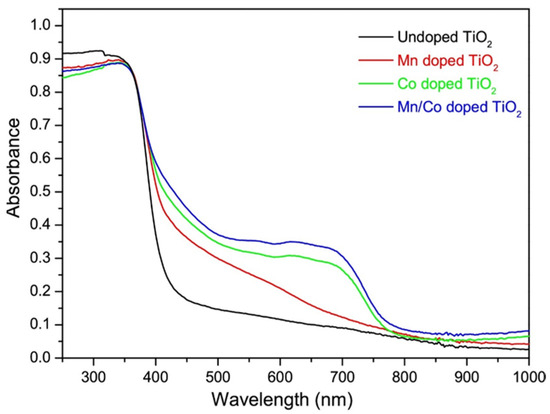 During photocatalytic oxidation, TiO2 absorbs radiation with energy exceeding its band gap, leading to the formation of photogenerated electrons. However, since TiO2 has a wide band gap (3.2 eV), ultraviolet (UV) light is required to initiate photocatalytic reactions. In indoor environments, where visible and near-infrared (IR) light predominate, this limits TiO2’s photocatalytic applications [102]. To address this challenge, researchers have investigated various doping strategies, using both metal and non-metal materials, to narrow the band gap and enhance TiO2’s efficiency under visible light [103].