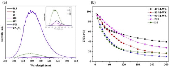 When the recombination of charge carriers occurs, it releases a certain amount of energy, which can be detected as a photoluminescence emission spectrum. There are two primary types of photoluminescence: band gap photoluminescence, which pertains to the separation of photogenerated charge carriers [82], and excitonic photoluminescence, which provides insights into oxygen vacancies and surface defects [83]. By analyzing excitonic photoluminescence, researchers can deduce other factors affecting photocatalysis, such as the efficiency of electron trapping and transfer. Consequently, the photoluminescence spectrum serves as an indicator of the recombination rate: a low intensity suggests minimal charge carrier recombination, indicating enhanced photocatalytic activity, while a high intensity signifies a high recombination rate [84].