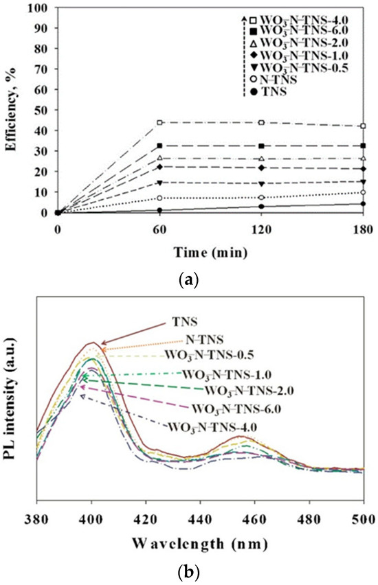TNS can be doped or form heterojunctions in order to enhance its photocatalytic efficiency. For instance [120], research synthesized N-doped TiO2 nanosheets/WO3 composites to observe the photocatalytic removal of hexane. From the UV-vis adsorption spectra, it has been observed that the N doping and the introduction of WO3 have successfully enhanced the adsorption properties of TiO2 nanosheets. The photoluminescence spectrum of the composite exhibited a lower intensity indicating a lower recombination rate compared to the TiO2 nanosheets. Finally, the photocatalytic oxidation of hexane has been observed and the efficiency of TNS increased due to the N doping and the heterojunction with WO2 and it has obtained a maximum photocatalytic efficiency of about 44%. The enhancement of the photocatalytic activity is due to the increase in the specific surface area.