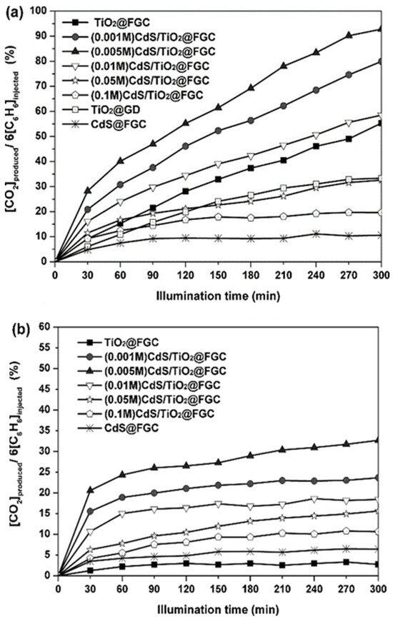 - Liu, Z.; Fang, P.; Wang, S.; Gao, Y.; Chen, F.; Zheng, F.; Liu, Y.; Dai, Y. Photocatalytic Degradation of Gaseous Benzene with CdS-Sensitized TiO2 Film Coated on Fiberglass Cloth. J. Mol. Catal. A Chem. 2012, 363, 159–165. [Google Scholar] [CrossRef]