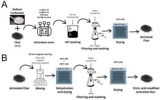 Activation of the char with Na2CO3 (A) and post-thermal citric acid treatment (B).
