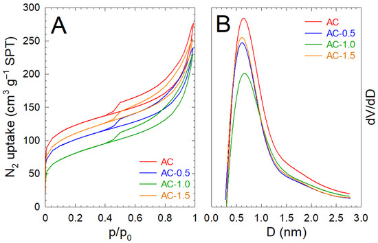 The char modified with CA 1 M led to a minimal rise in the textural properties, SBET = 19.4 m2 g−1, and VT = 0.074 cm3 g−1, probably due to the reaction of labile carbon during the acid treatment. However, microporosity was completely absent both in the char before and after CA modification. The CA treatment of the activated char with Na2CO3 produced a decrease in the total surface area and pore volume in all cases. The surface interactions of CA with the original AC display the occlusion of micropores and partial reaction with the most reactive surface groups, indicating lower micropore contribution with lower VMP/VT ratios. Similar findings have been reported during the CA modification of commercial activated carbon formulas, in which 34% of the surface area was registered [52]. From all the CA-modified samples, the AC-CA-1.0 outlines the highest mesoporosity reached after CA treatment, and consequently the lowest CO2 uptake due to the preferred microporosity contribution required by the adsorption of this molecule. Regarding the micropore size distribution, due to the use of Na2CO3 as an activating agent, the micropore size contribution registered in Figure 2B is addressed at 0.6–0.7 nm due to the CO2 released during the thermal decomposition of Na2CO3 [53].