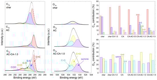 High-resolution XPS spectra of C1s (left) and O1s (middle) regions for char, AC, and AC-CA-1.0, and the deconvoluted contribution for all the samples (right).