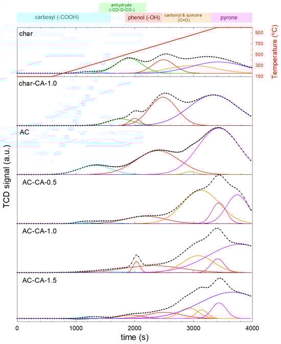 The nature of the oxygenated groups was further qualitatively evaluated by TPD. The TPD profiles are depicted in Figure 4. A tentative deconvolution was conducted based on the temperature at which the oxygenated functional groups decompose. According to the literature [63], carboxylic acids decompose below 400 °C, carboxylic anhydrides decompose between 350 and 600 °C, and lactones reveal a peak above 600 °C. Phenol groups are registered in a middle-temperature range of 500–750 °C, while carbonyl/quinone groups release CO above 700 °C. Finally, pyrone-like groups, if present, are released at 950 °C. On this basis, the TPD profiles were deconvoluted. The char showed the lowest release of TCD signal, attributable to low oxygenated species on the surface. After CA treatment of the char, the TCD signal rose, as a consequence of the oxygenated groups increasing. The activation of the char with Na2CO3 led to a material with the presence of carboxyl groups, phenol, and carbonyl groups resistant to thermal treatment, close to pyrone behavior. The CA post-thermal modification enriched the variety of carbonyl and quinone groups, with contributions at lower temperatures compared to the non-modified AC. Interestingly, the TPD profiles confirm that the modification with CA destroyed the presence of carboxyl groups as the concentration of CA increased. From the profiles attained, it can be concluded that the modification with CA enriched the variety of contributions ascribed to the range of release of carbonyl and quinone, mainly.