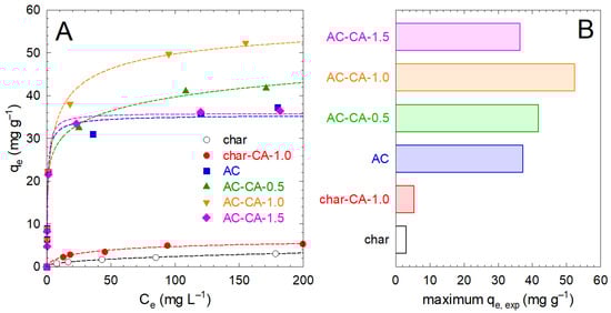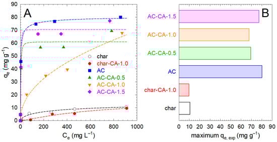 (A) Adsorption isotherms of lead with char and the activated carbon after citric acid modification. The dashed lines correspond to the Sips modeling. (B) Maximum experimental uptake of lead registered.