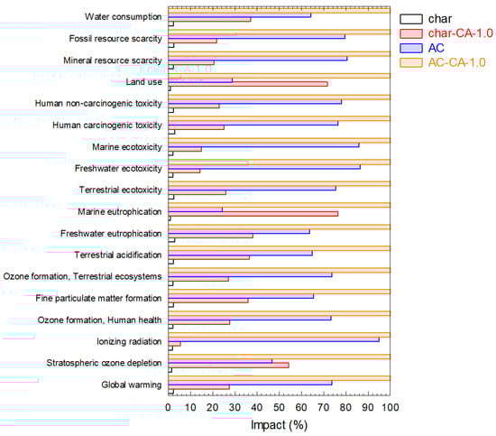 The results depicted in Figure 7 demonstrate that the scenarios involving citric acid utilization have an environmental impact that is markedly higher than that observed in scenarios that do not employ citric acid. This conclusion applies to all environmental impact categories. Overall, the environmental impact of washing and modifying the char with citric acid is 12 times higher than that of washing alone. Additionally, the environmental impact of washing, activating, and modifying the char with citric acid is 1.4 times higher than just the activated char. For all environmental impact categories, the scenario exhibiting the highest impact is one including washing, activation, and functionalization with citric acid. Furthermore, the process of activation makes a considerable contribution to the overall environmental impact. In all scenarios, the most significant contributor to the overall environmental impact is human carcinogenic toxicity, followed by freshwater and marine ecotoxicity. This is largely attributable to the high energy requirements of the drying processes. In conclusion, although modifying the char with citric acid may enhance the adsorption performance, it also considerably increases the environmental impact. Therefore, citric acid usage leads to enhanced adsorption uptake and minimizes the preparation and removal costs; however, its use results in detrimental consequences from an environmental point of view [77,78,79].