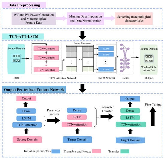 To address the above issue, this paper proposes a TCN-ATT-LSTM transfer learning method for wind and solar power forecasting that incorporates sensitive meteorological feature selection. This approach resolves the challenge of rapidly constructing adaptive models in data-scarce target wind and solar power sites while significantly improving prediction accuracy. The remaining structure of this paper is organized as follows. In Section 2, the overall framework of the proposed model is introduced. In Section 3, the selection method for sensitive meteorological feature factors and feature extraction by TCN-ATT-LSTM pretrained network are demonstrated. Case studies are given in Section 4, and the conclusions are presented in Section 5.